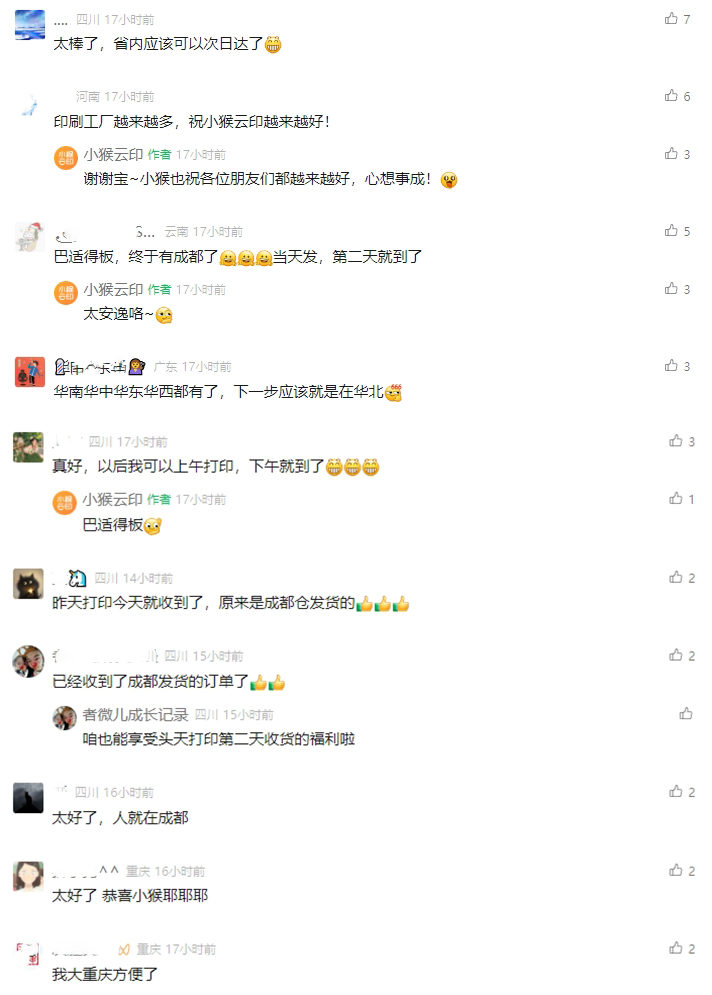 随着成都打印工厂的正式投产,小猴云印成功构建起广州、郑州、杭州、成都四大打印工厂的仓储物流网络。这一布局的最大优势在于实现了多仓就近发货,极大地缩短了订单处理和配送时间。以往,用户下单后,打印资料可能需要从较远的仓库发货,导致配送时间较长。如今,四大仓库的协同运作,让多地用户能够享受到次日达的高效配送服务。以成都地区的用户为例,以往打印资料从广州或郑州发货,可能需要3-5天才能送达;而现在,本地打印工厂直接发货,次日就能收到打印成品,大大提高了用户的使用体验。