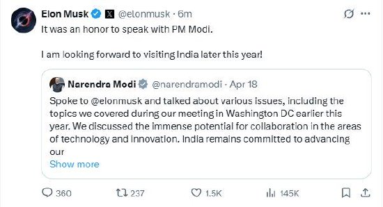 马斯克是在回应莫迪此前一天的帖子,后者写道:“与马斯克进行了交谈,并谈到了各种问题,包括我们今年早些时候在华盛顿特区会面时讨论的话题。我们讨论了在技术和创新领域合作的巨大潜力。印度仍然致力于在这些领域推进我们与美国的伙伴关系。”
